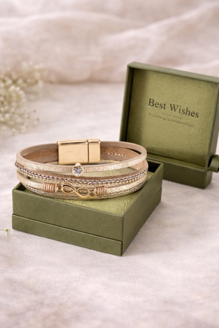 Setzen Sie ein stilvolles Statement mit meinem exklusiven Wickelarmband aus hochwertigem Kunstleder. Das mehrreihige Design umschmeichelt Ihr Handgelenk elegant und der magnetische Verschluss sorgt für müheloses Anlegen. Perfekt für jeden Anlass.