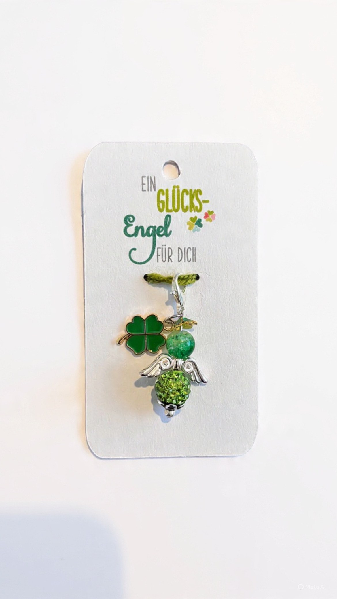 Perlenanhänger mit Glitzerperlen, normaler Perle, Flügel, Kleeblattanhänger und Karabiner zum Aufhängen. Grün gehalten und voller positiver Energie.
