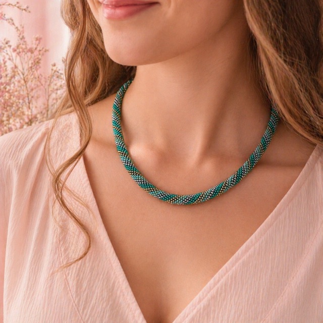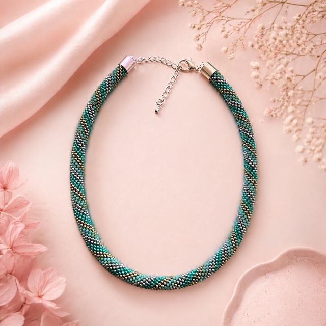 - Technik: Handgehäkelte Schlauchkette (Bead Crochet Rope).