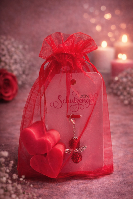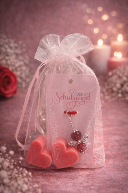 Im Organzasäckchen aus hochwertiger Original Florex Schafmilchseife sowie ein schützender Perlenengel als kleiner Begleiter für jeden Tag.