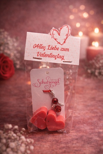 Im Cellophansäckchen, dekoriert mit dem Aufdruck „Alles Liebe zum Valentinstag“, befindet sich ein roter Perlenanhänger als symbolischer Schutzengel sowie zwei duftende Mini-Herzseifen aus Original Florex Schafmilchseife.